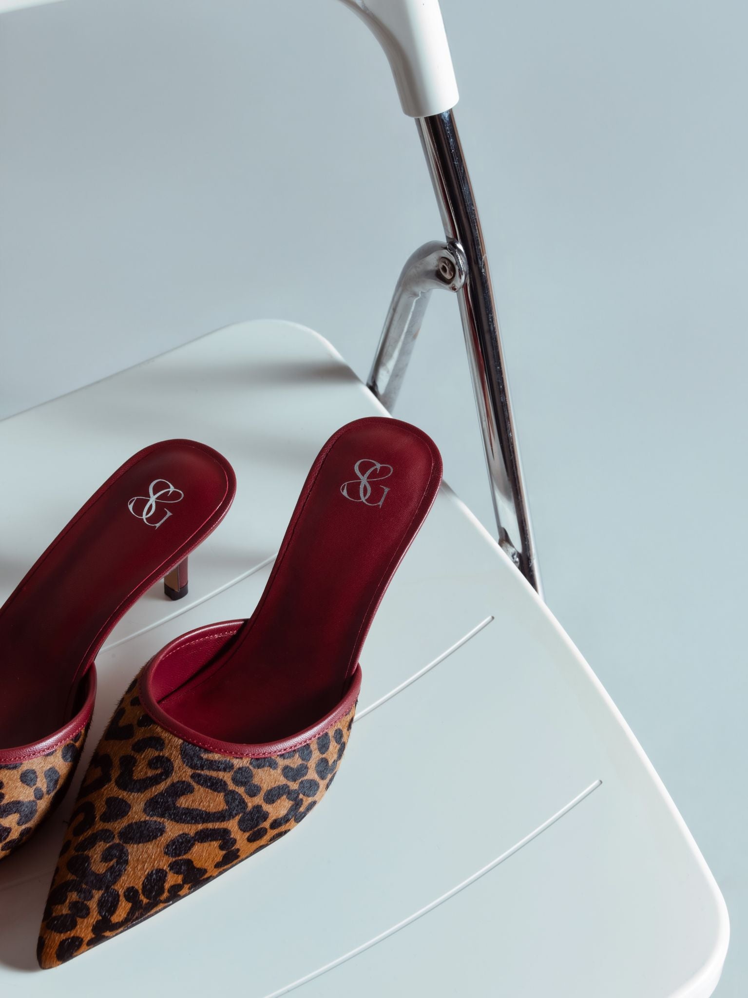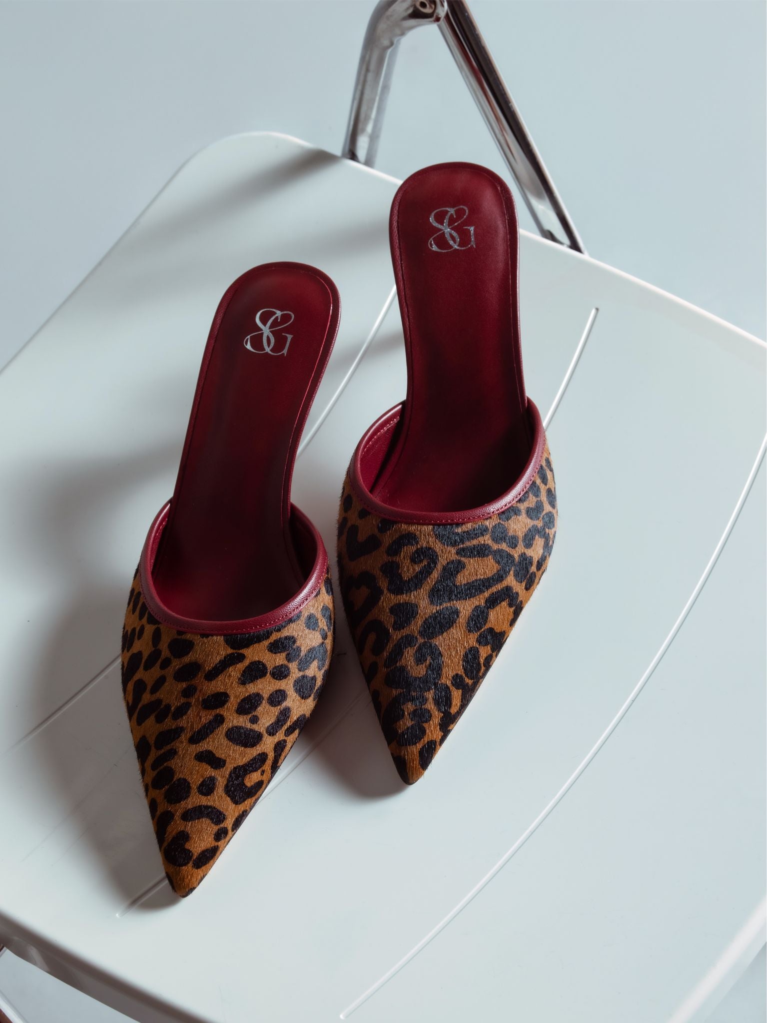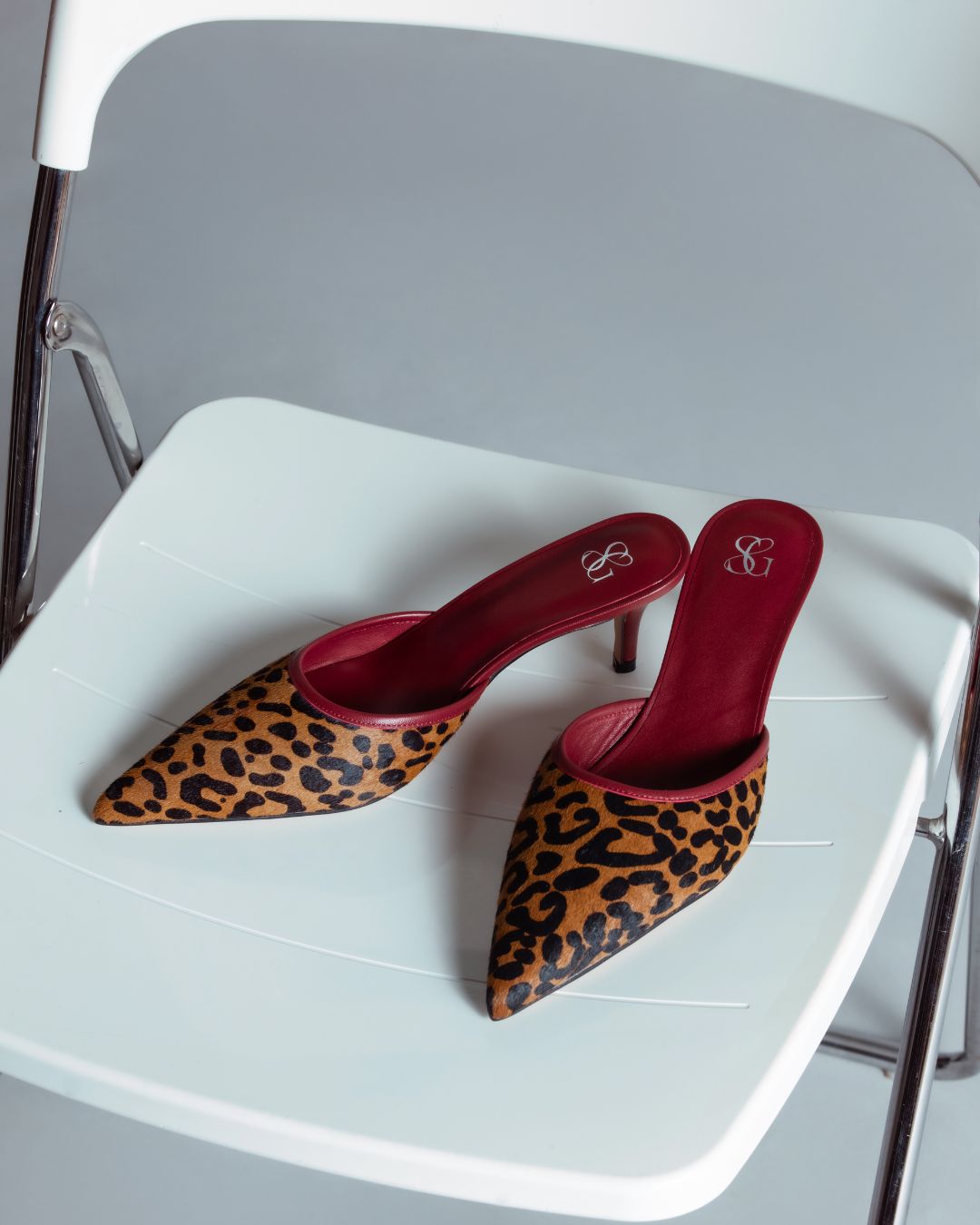 Materials of genuine leather and pony hair, it pairs classic leopard print with deep red trimming